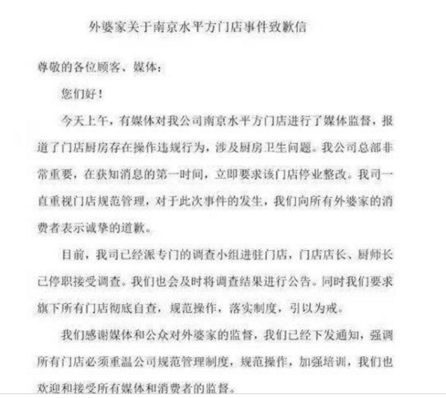對于上述視頻中外婆家存在的問題,3月15日中午,公司創(chuàng)始人吳國平做出回應(yīng):發(fā)布致歉信稱向廣大消費(fèi)者致歉,對門店進(jìn)行整改并處罰相關(guān)責(zé)任人,并表示將會對涉事門店進(jìn)行停業(yè)整頓。