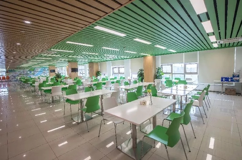 整個(gè)食堂占地面積1800平方米,提供早、中、晚三餐;整體配色選用了通聯(lián)支付logo色“橙、黃、藍(lán)、綠”四種顏色,活潑中帶點(diǎn)俏皮,身處其中,讓人不禁心情愉悅。600個(gè)餐位,哪怕用餐高峰,也可從容就餐。