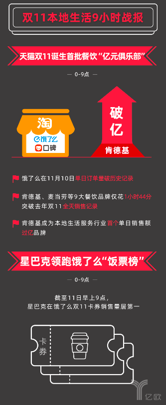 2019年11月11日,口碑餓了么透露,當(dāng)日上午8:29分,肯德基在2019天貓雙11全球狂歡節(jié)上的銷售額正式突破1億元。這是我國(guó)本地生活行業(yè)首個(gè)單日銷售額過億的品牌。