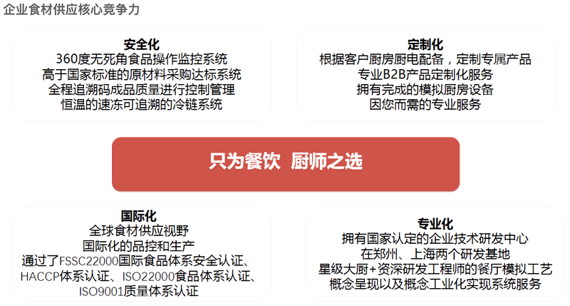 基于這些要點,今年中膳集團創(chuàng)造了優(yōu)鏈云模式。在行業(yè)中,中膳優(yōu)鏈云選擇多品類,雙渠道,加工+流通模式;二是輕模式,自營型,做聯(lián)盟+類加盟+集團管控模式。簡單來說,可以自營建立高壁壘和強客戶粘性,提升保障服務體系。構建體系和標準后,再做全品類,服務型,加盟標準+統(tǒng)一服務模式。大型餐飲連鎖企業(yè)大多會自建供應鏈,因此,中膳優(yōu)鏈云則瞄準中型餐飲企業(yè)目標對象。